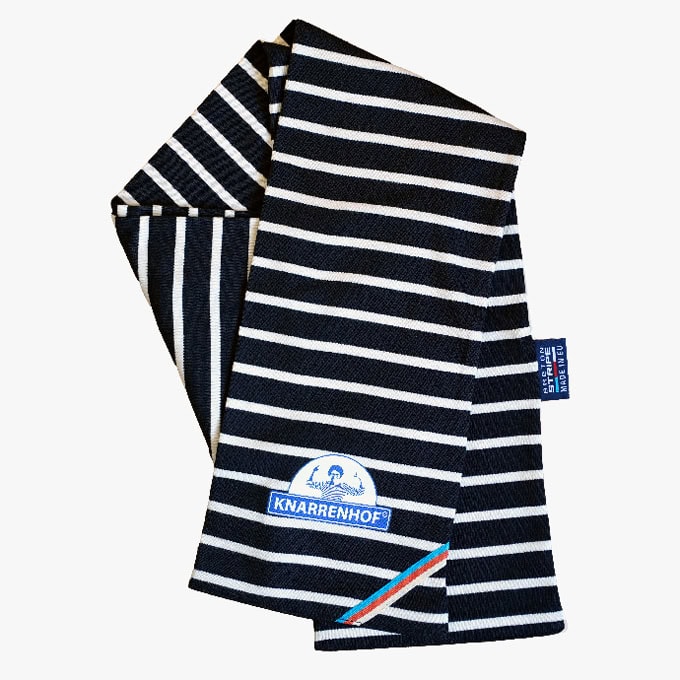 Dieser Bretonische Schal mit Knarrenhof Logo ist ein ideales Zubehör, um Ihr Outfit zu vervollständigen. Er ist aus 100% Baumwolle (Heavy Jersey) gefertigt und auf faire Weise produziert. Das ist schön zu wissen! Ein angenehmes Accessoire.